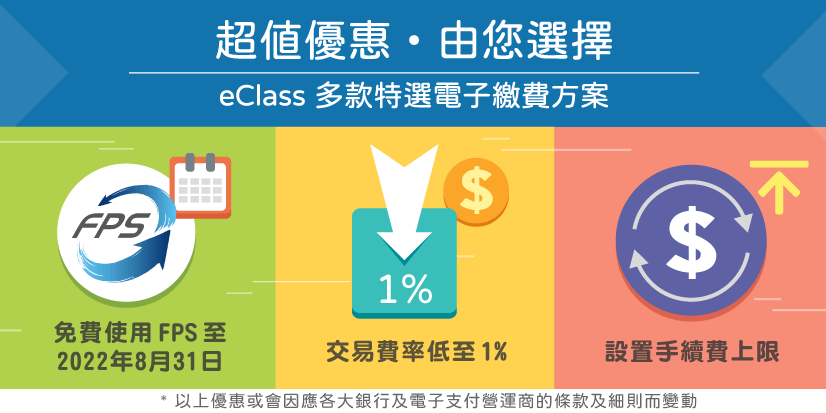 優惠期有限,有興趣的同工敬請盡快致電 3913 3133,聯絡 eClass 方案顧問以查詢 ePayment 電子繳費服務詳情。